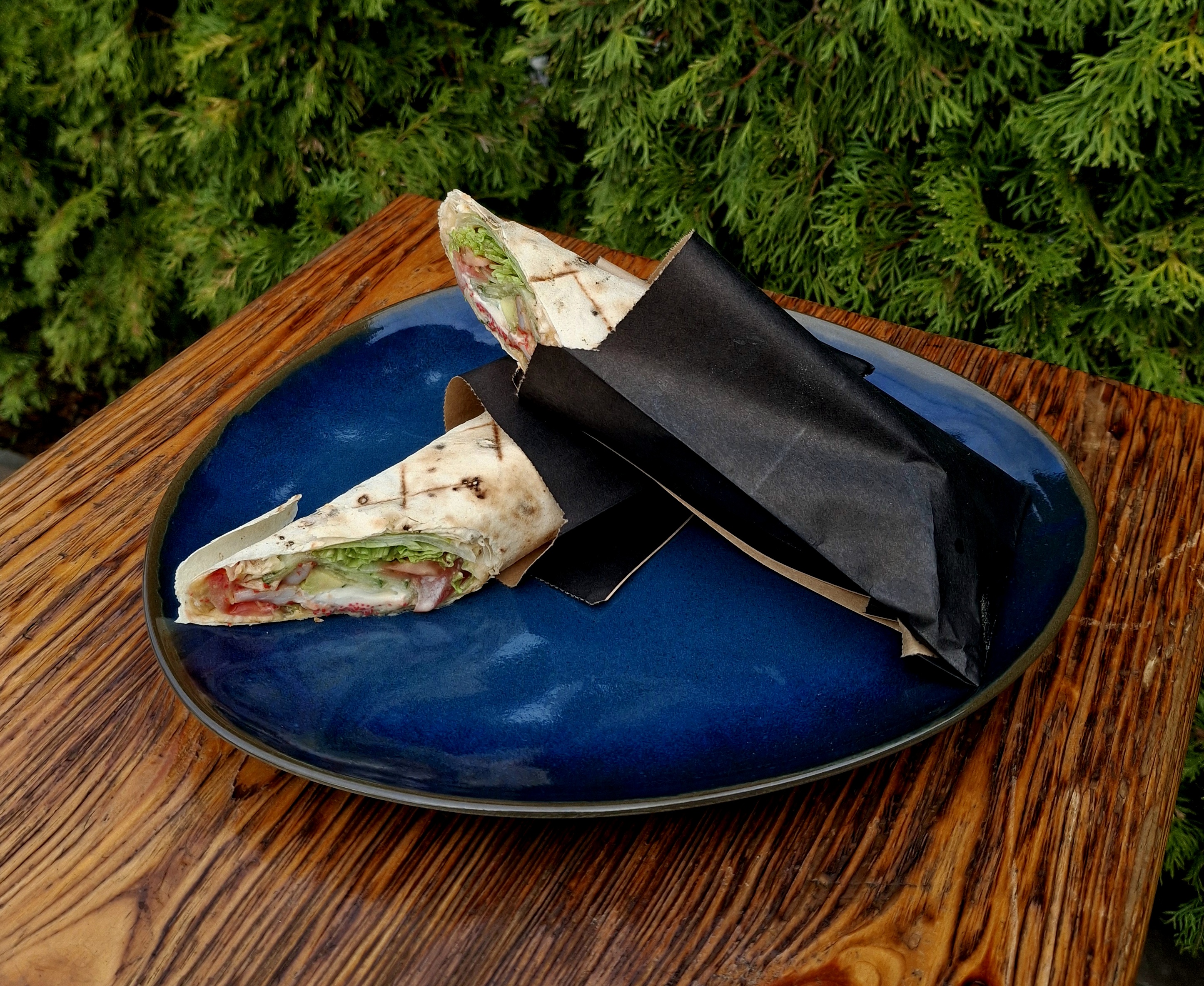 Склад: лаваш, вирізка телятина, огірок маринований, томат свіжий, яйце куряче смажене, перець болгарський гриль, мікс салат, соус сирний, соус чилі, цибуля маринована, спеції